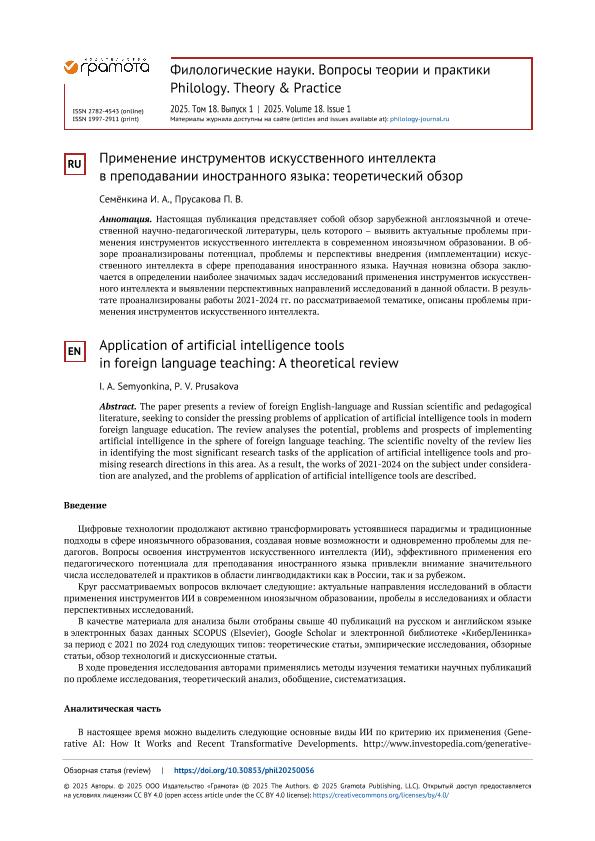Семёнкина, И.А. Применение инструментов искусственного интеллекта в преподавании иностранного языка: теоретический обзор / И.А. Семёнкина, П.В. Прусакова // Филологические науки. Вопросы теории и практики. – 2025. – № 1. — С. 384-392. — Только в электронном виде. — <URL:http://elib.fa.ru/art2025/bv671.pdf>.