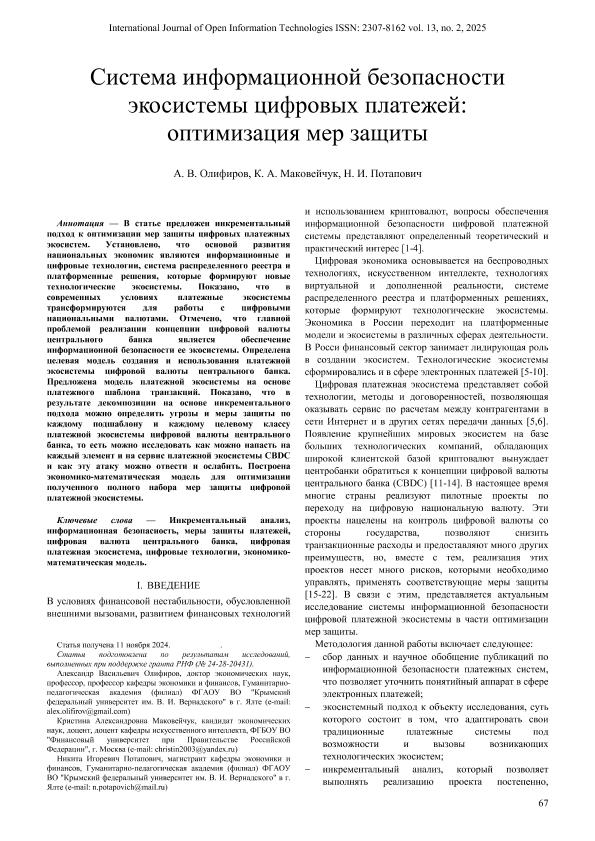 Олифиров, А.В. Система информационной безопасности экосистемы цифровых платежей: оптимизация мер защиты / А.В. Олифиров, К.А. Маковейчук, Н.И. Потапович // International Journal of Open Information Technologies. – 2025. – № 2. — С. 67-72. — Только в электронном виде. — <URL:http://elib.fa.ru/art2025/bv672.pdf>.