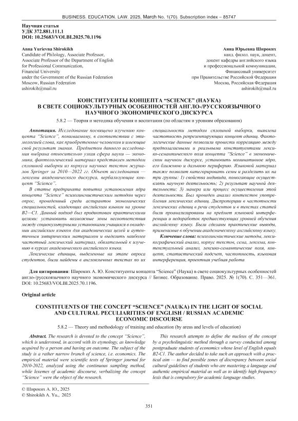 Широких, А.Ю. Конституенты концепта “Science” (Наука) в свете социокультурных особенностей англо- русскоязычного научного экономического дискурса // Бизнес. Образование. Право. – 2025. – № 1. — С. 351-361. — Только в электронном виде. — <URL:http://elib.fa.ru/art2025/bv673.pdf>.