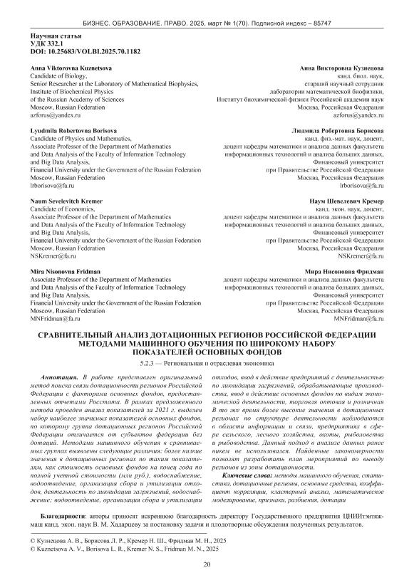 Сравнительный анализ дотационных регионов Российской Федерации методами машинного обучения по широкому набору показателей основных фондов / А.В. Кузнецова, Л.Р. Борисова, Н.Ш. Кремер, М.Н. Фридман // Бизнес. Образование. Право. – 2025. – № 1. — С. 20-28. — Только в электронном виде. — <URL:http://elib.fa.ru/art2025/bv674.pdf>.