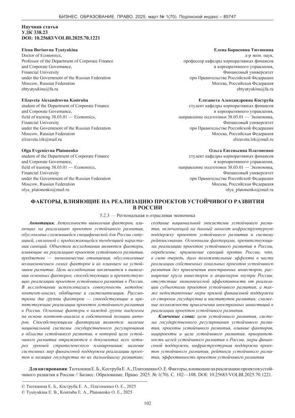 Тютюкина, Е.Б. Факторы, влияющие на реализацию проектов устойчивого развития в России / Е.Б. Тютюкина, Е.А. Коструба, О.Е. Платоненко // Бизнес. Образование. Право. – 2025. – № 1. — С. 102-108. — Только в электронном виде. — <URL:http://elib.fa.ru/art2025/bv675.pdf>.