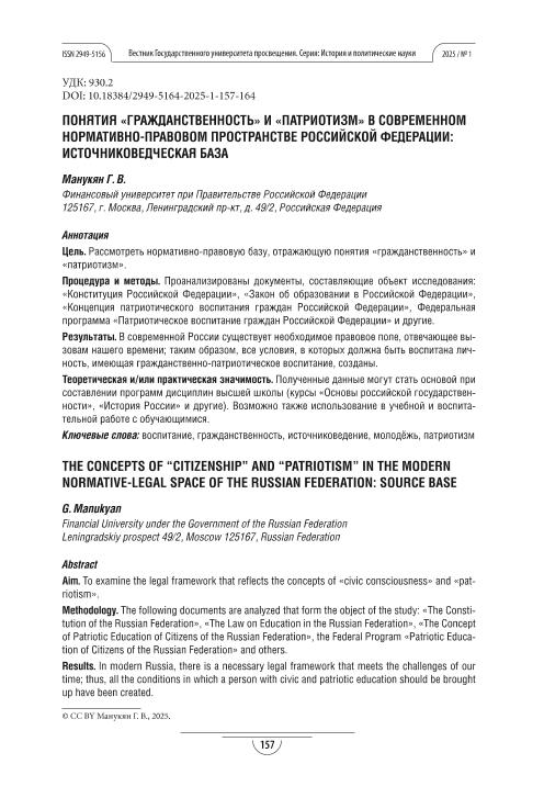 Манукян, Г.В. Понятия «гражданственность» и «патриотизм» в современном нормативно-правовом пространстве Российской Федерации: источниковедческая база // Вестник Государственного университета просвещения. Серия: История и политические науки. – 2025. – № 1. — С. 157-164. — Только в электронном виде. — <URL:http://elib.fa.ru/art2025/bv676.pdf>.