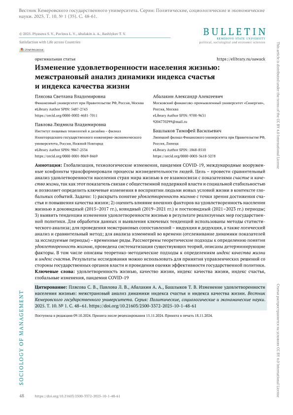 межстрановый анализ динамики индекса счастья и индекса качества жизни / С.В. Плясова, Л.В. Павлова, А.А. Абалакин, Т.В. Башлыков // Вестник Кемеровского государственного университета. Серия: Политические, социологические и экономические науки. – 2025. – № 1. — С. 48-61. — Только в электронном виде. — <URL:http://elib.fa.ru/art2025/bv677.pdf>.