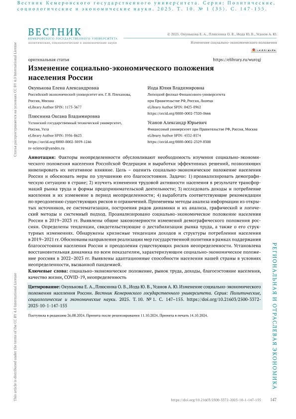 населения России / Е.А. Окунькова, О.В. Плюснина, Ю.В. Иода, А.Ю. Усанов // Вестник Кемеровского государственного университета. Серия: Политические, социологические и экономические науки. – 2025. – № 1. — С. 147-155. — Только в электронном виде. — <URL:http://elib.fa.ru/art2025/bv678.pdf>.