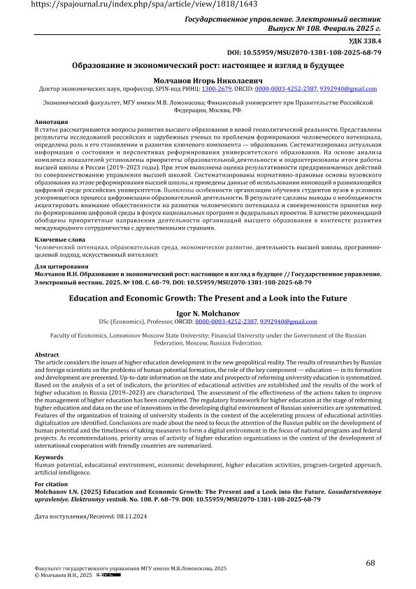 Молчанов, И.Н. Образование и экономический рост: настоящее и взгляд в будущее. — Текст: электронный // Государственное управление. Электронный вестник. – 2025. – № 108. — С.68-79. - URL: https://spajournal.ru/index.php/spa/article/view/1818/1643. - Дата публикации: 26.02.2025 — <URL:http://elib.fa.ru/art2025/bv679.pdf>.
