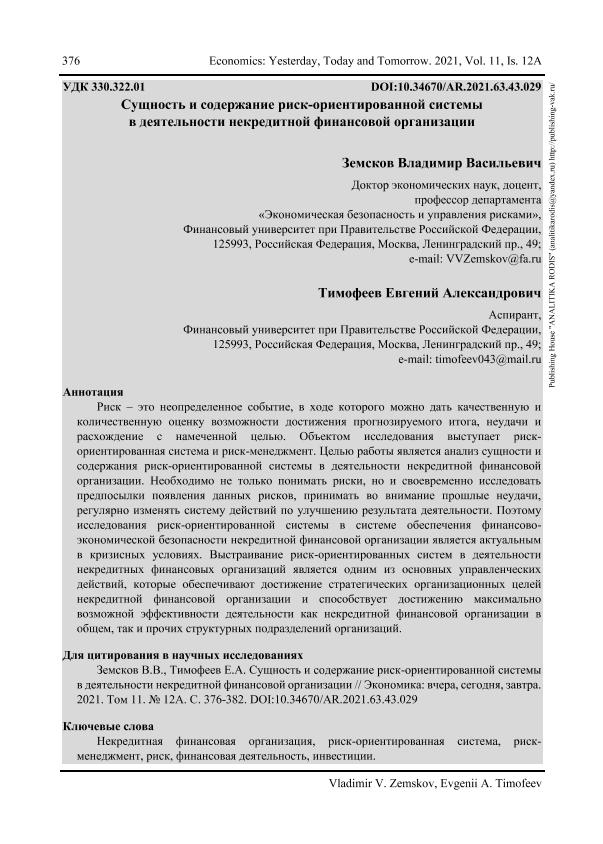 Земсков В.В. Сущность и содержание риск-ориентированной системы в деятельности некредитной финансовой организации / Земсков В.В., Тимофеев Е.А. // Экономика: вчера, сегодня, завтра. – 2021. – № 12А.-С.376-382. — Только в электронном виде. — <URL:http://elib.fa.ru/art2021/bv3523.pdf>.