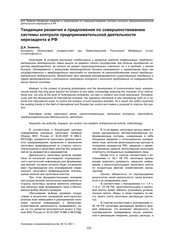 нерезидента в РФ // Экономика и предпринимательство. – 2021. – № 12.-С.737-740. — Только в электронном виде. — <URL:http://elib.fa.ru/art2021/bv3524.pdf>.