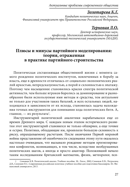 Золотарева К.Г. Плюсы и минусы партийного моделирования: теория, отраженная в практике партийного строительства / Золотарева К.Г., Терновая Л.О. // Этносоциум. – 2021. – № 11-12.-С.27-37 — <URL:http://elib.fa.ru/art2021/bv3525.pdf>.