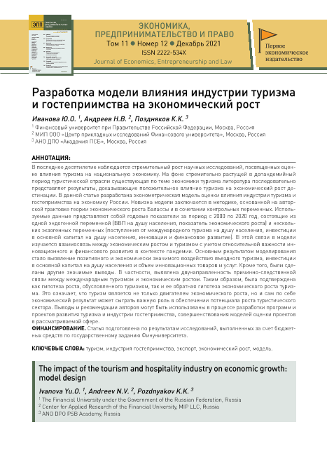 Иванова Ю.О. Разработка модели влияния индустрии туризма и гостеприимства на экономический рост / Иванова Ю.О., Андреев Н.В., Поздняков К.К. // Экономика, предпринимательство и право. – 2021. – № 12.-С.2979-2992. — Только в электронном виде. — <URL:http://elib.fa.ru/art2021/bv3526.pdf>.
