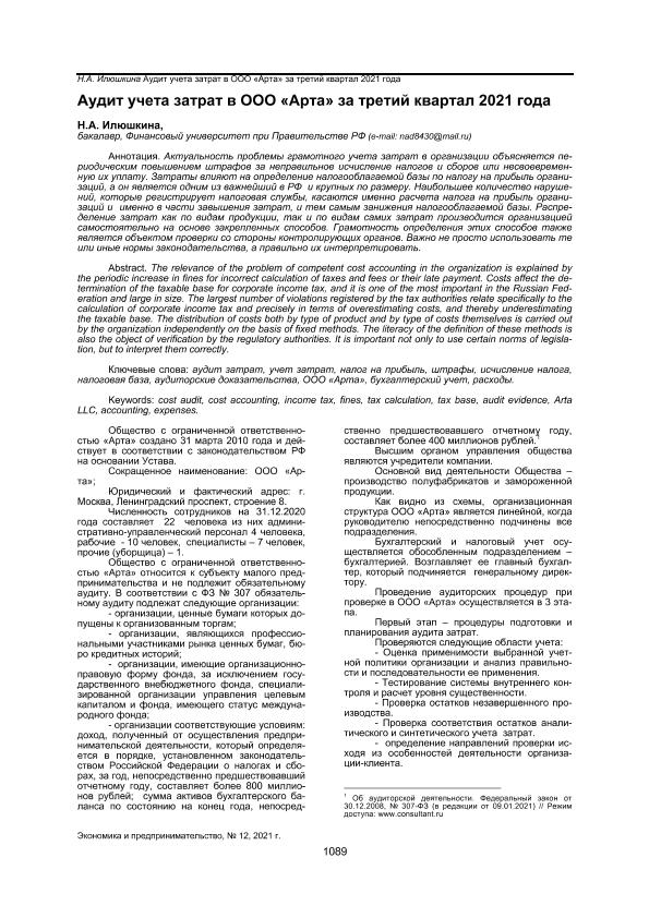 Илюшкина Н.А. Аудит учета затрат в ООО «Арта» за третий квартал 2021 года // Экономика и предпринимательство. – 2021. – № 12.-С.1089-1093. — Только в электронном виде. — <URL:http://elib.fa.ru/art2021/bv3528.pdf>.