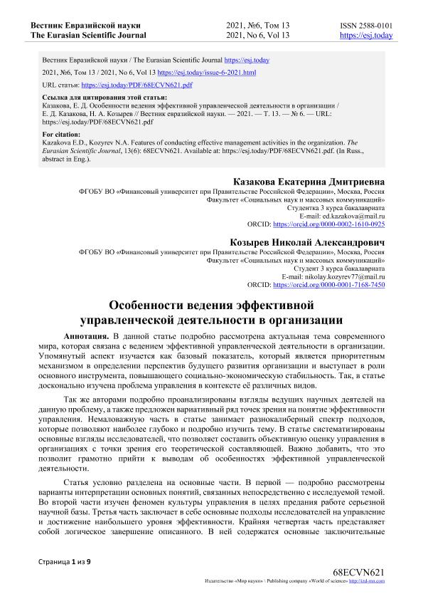 Казакова Е.Д. Особенности ведения эффективной управленческой деятельности в организации / Казакова Е.Д., Козырев Н.А. — Текст: электронный // Вестник Евразийской науки. – 2021. – № 6.- URL: https://esj.today/PDF/68ECVN621.pdf (дата обращения: 07.10.2022) — <URL:http://elib.fa.ru/art2021/bv3529.pdf>.