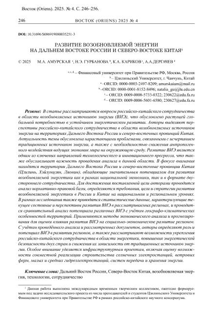 Развитие возобновляемой энергии на Дальнем Востоке России и Северо-Востоке Китая / М.А. Амурская, Н.Э. Гурбанова, К.А. Кариков, А.А. Дергачев // Восток (Oriens). – 2025. – № 4. — С. 246–256. — Только в электронном виде. — <URL:http://elib.fa.ru/art2025/bv1074.pdf>.