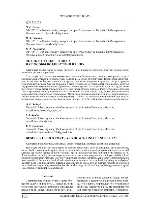 Ракоч, О.Е. Деликты этики бизнеса и способы воздействия на них / О.Е. Ракоч, И.А. Рыбина, В.Д. Тимонина // Вестник Алтайской академии экономики и права. – 2025. – № 3-1. — С. 136-145. — Только в электронном виде. — <URL:http://elib.fa.ru/art2025/bv1076.pdf>.