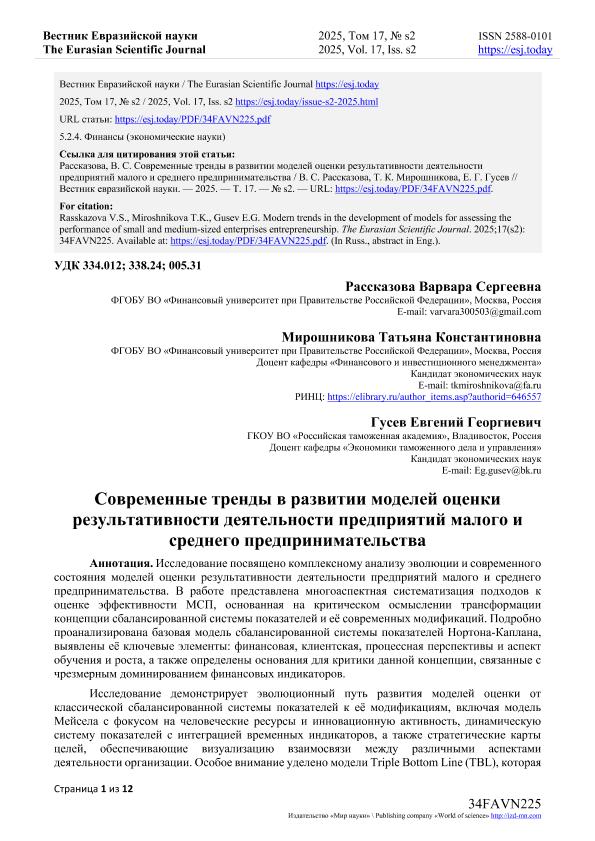 Рассказова, В.С. Современные тренды в развитии моделей оценки результативности деятельности предприятий малого и среднего предпринимательства / В.С. Рассказова, Т.К. Мирошникова, Е.Г. Гусев. — Текст: электронный // Вестник Евразийской науки. – 2025. – № s2. — URL: https://esj.today/PDF/34FAVN225.pdf (дата обращения: 28.10.2025) — <URL:http://elib.fa.ru/art2025/bv1077.pdf>.