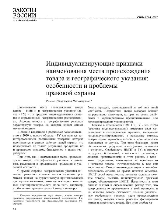 Рахматулина, Р.Ш. Индивидуализирующие признаки наименования места происхождения товара и географического указания: особенности и проблемы правовой охраны // Законы России: опыт, анализ, практика. – 2025. – № 8. — С. 54-58. — Хранение – Щербаковская, 38. — <URL:http://elib.fa.ru/art2025/bv1078.pdf>.