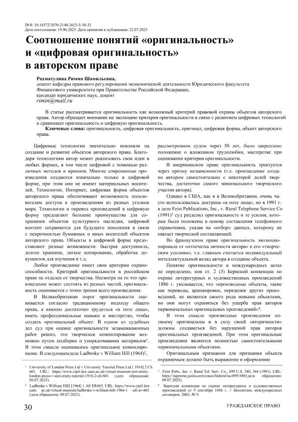 Рахматулина, Р.Ш. Соотношение понятий «оригинальность» и «цифровая оригинальность» в авторском праве // Гражданское право. – 2025. – № 5. — С. 30-32. — Хранение – Щербаковская, 38. — <URL:http://elib.fa.ru/art2025/bv1079.pdf>.