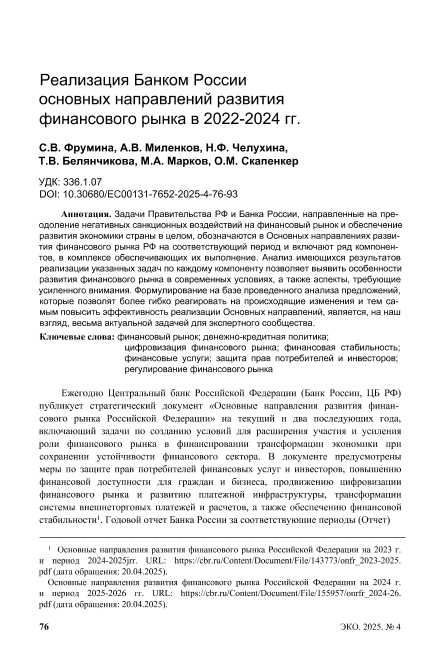 Реализация Банком России основных направлений развития финансового рынка в 2022-2024 гг. / С.В. Фрумина, А.В. Миленков, Н.Ф. Челухина [и др.] // Эко. – 2025. – № 4. — Хранение – Олеко Дундича, 23. — <URL:http://elib.fa.ru/art2025/bv1080.pdf>.