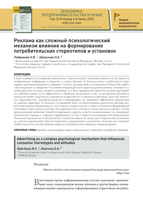 Ребрикова, Н.В. Реклама как сложный психологический механизм влияния на формирование потребительских стереотипов и установок / Н.В. Ребрикова, О.А. Шальнова // Экономика, предпринимательство и право. – 2025. – № 6. — С. 4235–4252. — Только в электронном виде. — <URL:http://elib.fa.ru/art2025/bv1081.pdf>.