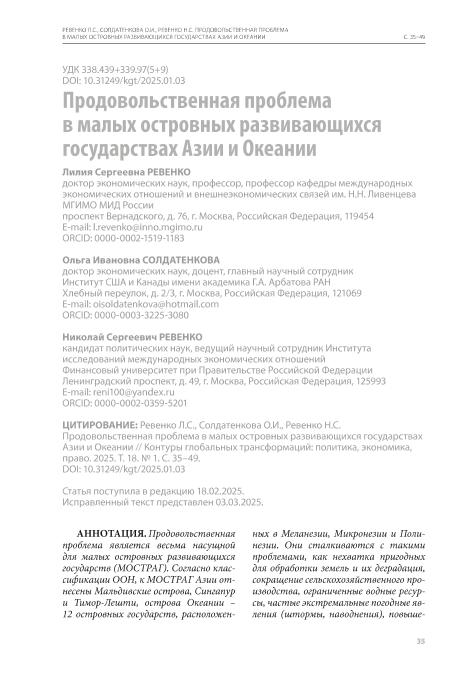Ревенко, Л.С. Продовольственная проблема в малых островных развивающихся государствах Азии и Океании / Л.С. Ревенко, О.И. Солдатенкова, Н.С. Ревенко // Контуры глобальных трансформаций: политика, экономика, право. – 2025. – № 1. — С. 35-49. — Только в электронном виде. — <URL:http://elib.fa.ru/art2025/bv1082.pdf>.