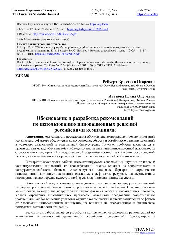 Рейхерт, К.И. Обоснование и разработка рекомендаций по использованию инновационных решений российскими компаниями / К.И. Рейхерт, Ю.О. Иванова. — Текст: электронный // Вестник Евразийской науки. – 2025. – № s1. — URL: https://esj.today/PDF/78FAVN125.pdf (дата обращения: 08.10.2025) — <URL:http://elib.fa.ru/art2025/bv1083.pdf>.