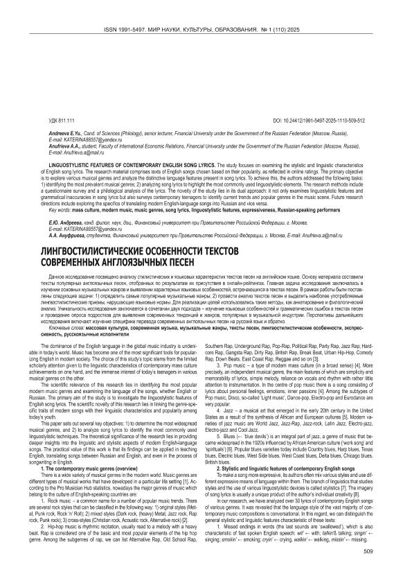 Andreeva E.Yu. (Андреева Е.Ю.). Linguostylistic Features of Contemporary English Song Lyrics = Лингвостилистические особенности текстов современных англоязычных песен / Andreeva E.Yu. (Андреева Е.Ю.), Anufrieva A.A. (Ануфриева А.А.) // Мир науки, культуры, образования. – 2025. – № 1. — С. 509-512. — Только в электронном виде. — <URL:http://elib.fa.ru/art2025/bv1323.pdf>.