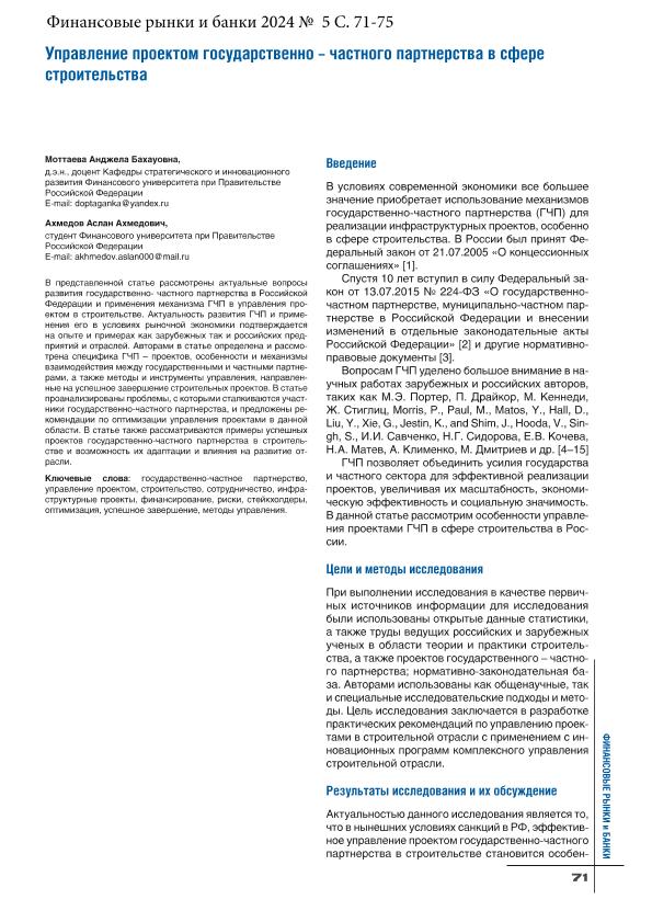 Моттаева, А.Б. Управление проектом государственно – частного партнерства в сфере строительства / А.Б. Моттаева, А.А. Ахмедов // Финансовые рынки и банки. – 2024. – № 5. — С. 71-75. — Только в электронном виде. — <URL:http://elib.fa.ru/art2024/bv3379.pdf>.