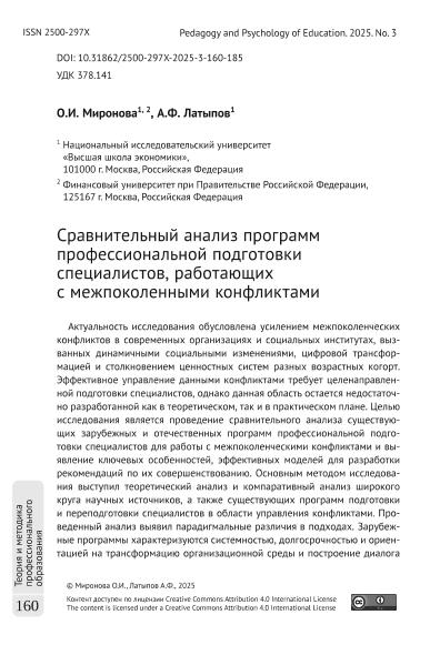 Миронова, О.И. Сравнительный анализ программ профессиональной подготовки специалистов, работающих с межпоколенными конфликтами / О.И. Миронова, А.Ф. Латыпов // Педагогика и психология образования. – 2025. – № 3. — С. 160-185. — Только в электронном виде. — <URL:http://elib.fa.ru/art2025/bv1439.pdf>.