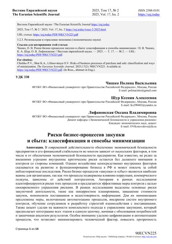 Чишко, П.В. Риски бизнес-процессов закупки и сбыта: классификация и способы минимизации / П.В. Чишко, К.А. Шур, О.В. Лифановская. — Текст: электронный // Вестник Евразийской науки. – 2025. – № 2. — URL: https://esj.today/PDF/90ECVN225.pdf (дата обращения: 20.10.2025) — <URL:http://elib.fa.ru/art2025/bv1607.pdf>.