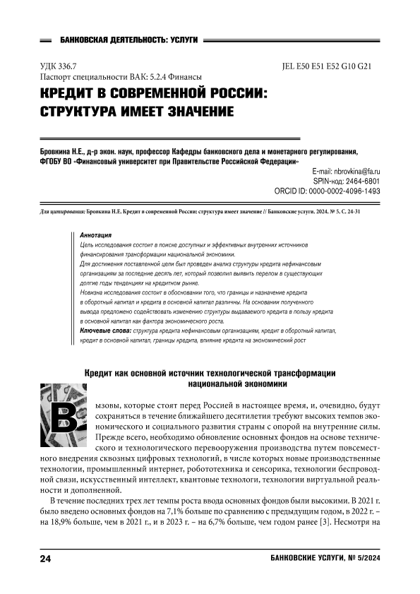 Бровкина, Н.Е. Кредит в современной России: структура имеет значение // Банковские услуги. – 2024. – № 5. — С. 24-31. — Только в электронном виде. — <URL:http://elib.fa.ru/art2024/bv3314.pdf>.