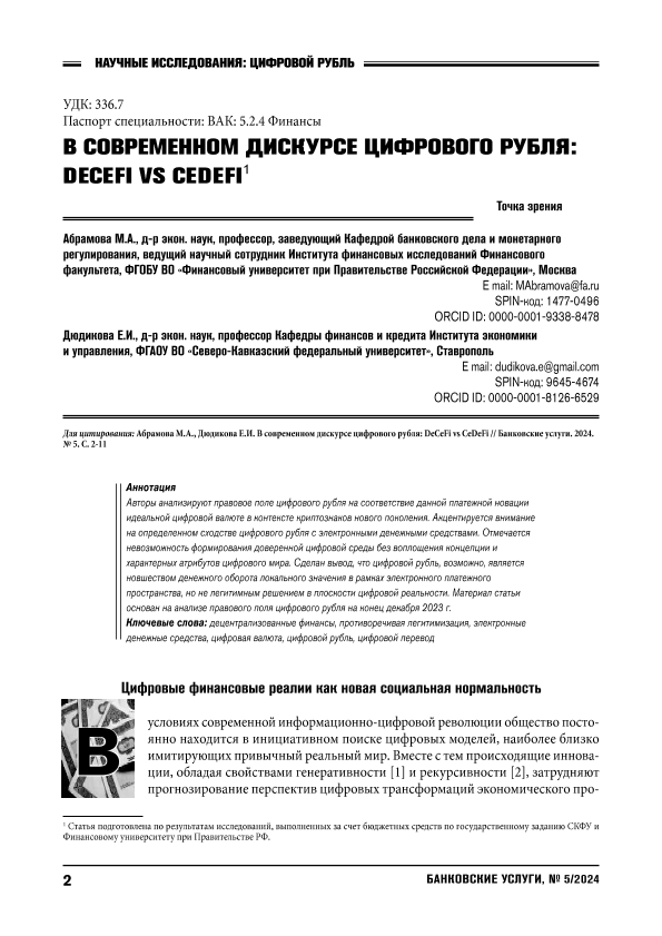 Абрамова, М.А. В современном дискурсе цифрового рубля: DeСeFi vs СeDeFi / М.А. Абрамова, Е.И. Дюдикова // Банковские услуги. – 2024. – № 5. — С. 2-11. — Только в электронном виде. — <URL:http://elib.fa.ru/art2024/bv3315.pdf>.