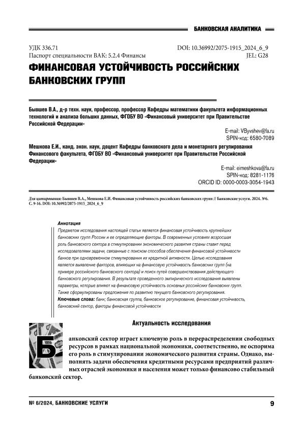 Бывшев, В.А. Финансовая устойчивость российских банковских групп / В.А. Бывшев, Е.И. Мешкова // Банковские услуги. – 2024. – № 6. — С. 9-16. — Только в электронном виде. — <URL:http://elib.fa.ru/art2024/bv3316.pdf>.
