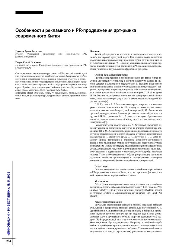 Грушева, А.А. Особенности рекламного и PR-продвижения арт-рынка современного Китая / А.А. Грушева, С.Н. Гавров // Инновации и инвестиции. – 2025. – № 5. — С. 234-236. — Только в электронном виде. — <URL:http://elib.fa.ru/art2025/bv1710.pdf>.