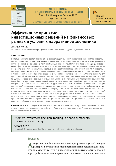 Илькевич, С.В. Эффективное принятие инвестиционных решений на финансовых рынках в условиях нарративной экономики // Экономика, предпринимательство и право. – 2025. – № 4. — С. 2827–2844. — Только в электронном виде. — <URL:http://elib.fa.ru/art2025/bv605.pdf>.
