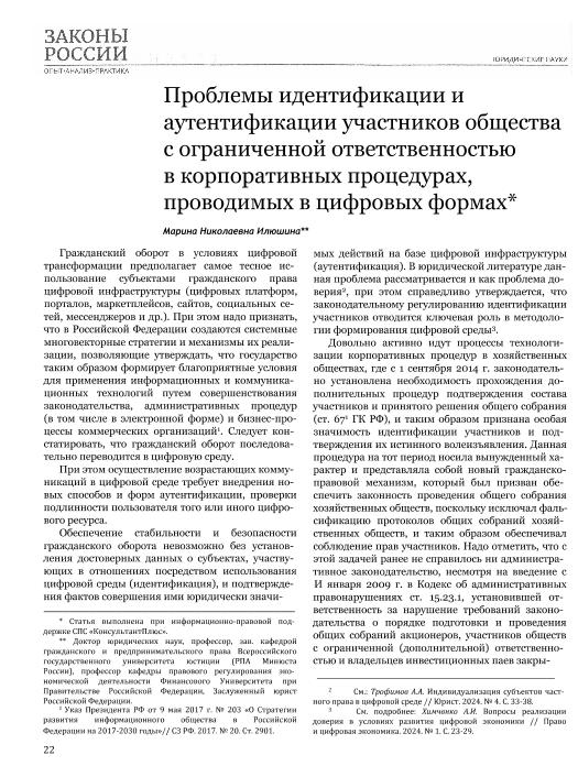 Илюшина, М.Н. Проблемы идентификации и аутентификации участников общества с ограниченной ответственностью в корпоративных процедурах, проводимых в цифровых формах // Законы России: опыт, анализ, практика. – 2025. – № 8. — С. 22-26. — Хранение – Щербаковская, 38. — <URL:http://elib.fa.ru/art2025/bv606.pdf>.