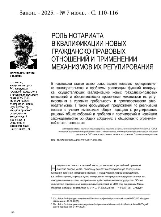 Илюшина, М.Н. Роль нотариата в квалификации новых гражданско-правовых отношений и применении механизмов их регулирования // Закон. – 2025. – № июль. — С. 110-116. — Хранение – Щербаковская, 38. — <URL:http://elib.fa.ru/art2025/bv607.pdf>.