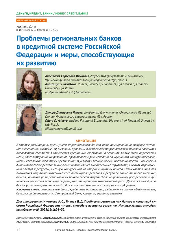 Инчикова, А.C. Проблемы региональных банков в кредитной системе Российской Федерации и меры, способствующие их развитию / А.C. Инчикова, Д.Д. Ялаева // Научные записки молодых исследователей. – 2025. – № 1. — С. 24-32 — <URL:http://elib.fa.ru/art2025/bv608.pdf>.