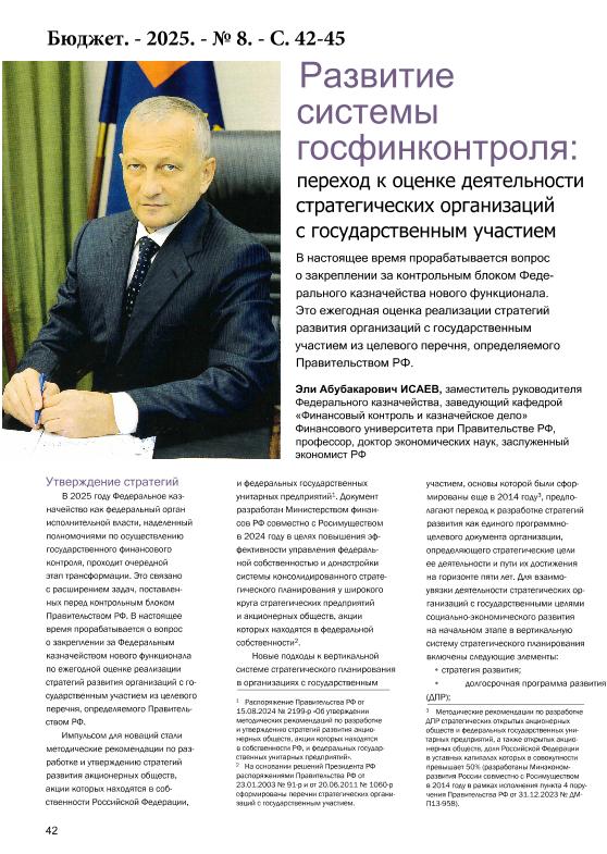 Исаев, Э.А. Развитие системы госфинконтроля: переход к оценке деятельности стратегических организаций с государственным участием // Журнал Бюджет. – 2025. – № 8. — С. 42-45 — <URL:http://elib.fa.ru/art2025/bv610.pdf>.