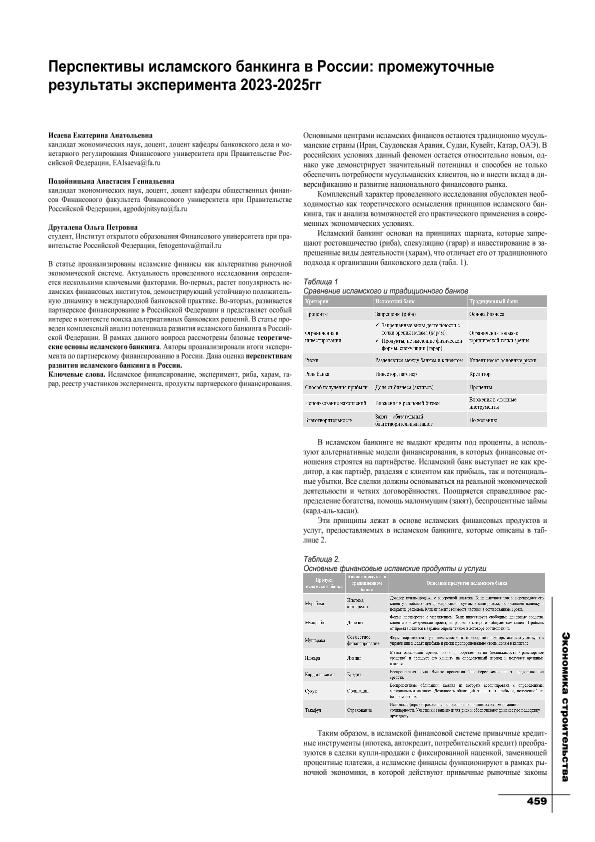 Исаева, Е.А. Перспективы исламского банкинга в России: промежуточные результаты эксперимента 2023-2025 гг. / Е.А. Исаева, А.Г. Подойницына, О.П. Другалева // Экономика строительства. – 2025. – № 4. — С. 459-462. — Только в электронном виде. — <URL:http://elib.fa.ru/art2025/bv612.pdf>.