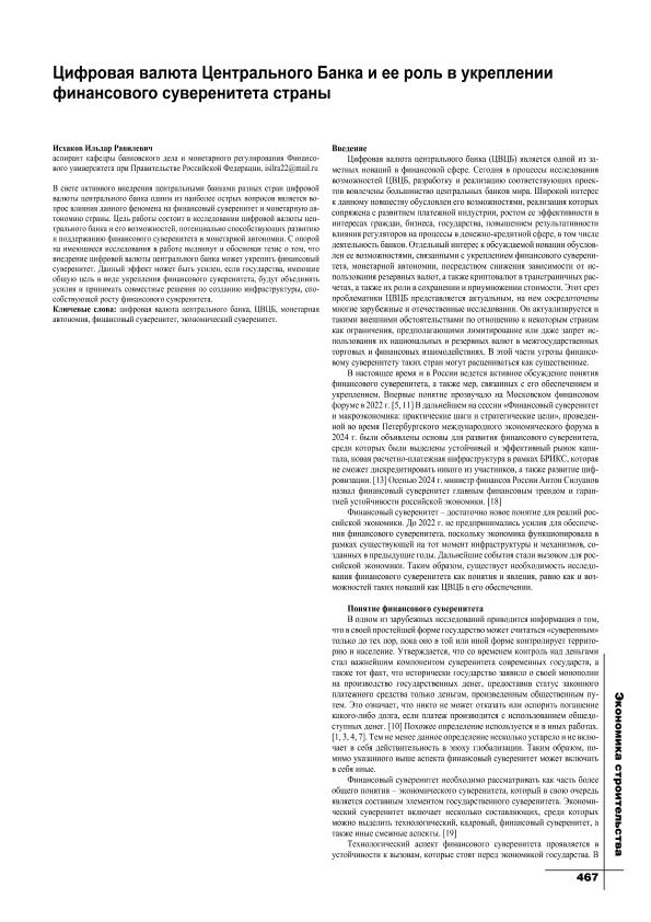 Исхаков, И.Р. Цифровая валюта Центрального Банка и ее роль в укреплении финансового суверенитета страны // Экономика строительства. – 2025. – № 4. — С. 467-470. — Только в электронном виде. — <URL:http://elib.fa.ru/art2025/bv614.pdf>.