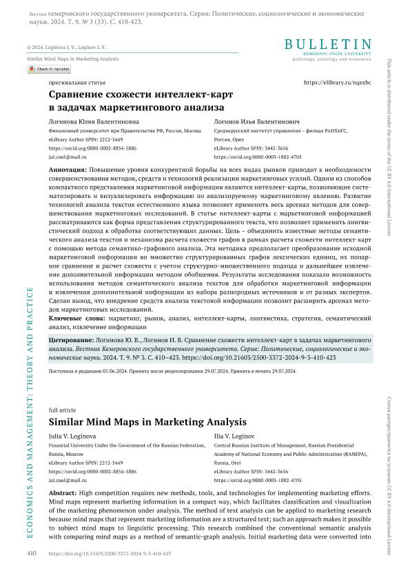 Логинова, Ю.В. Сравнение схожести интеллект-карт в задачах маркетингового анализа / Ю.В. Логинова, И.В. Логинов // Вестник Кемеровского государственного университета. Серия: Политические, социологические и экономические науки. – 2024. – № 3. — С. 410-423. — Только в электронном виде. — <URL:http://elib.fa.ru/art2024/bv3493.pdf>.