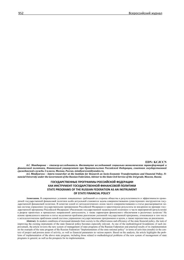 Миндиярова, А.С. Государственные программы Российской Федерации как инструмент государственной финансовой политики // Вестник Академии знаний. – 2024. – № 6. — С. 952-956. — Только в электронном виде. — <URL:http://elib.fa.ru/art2024/bv3495.pdf>.