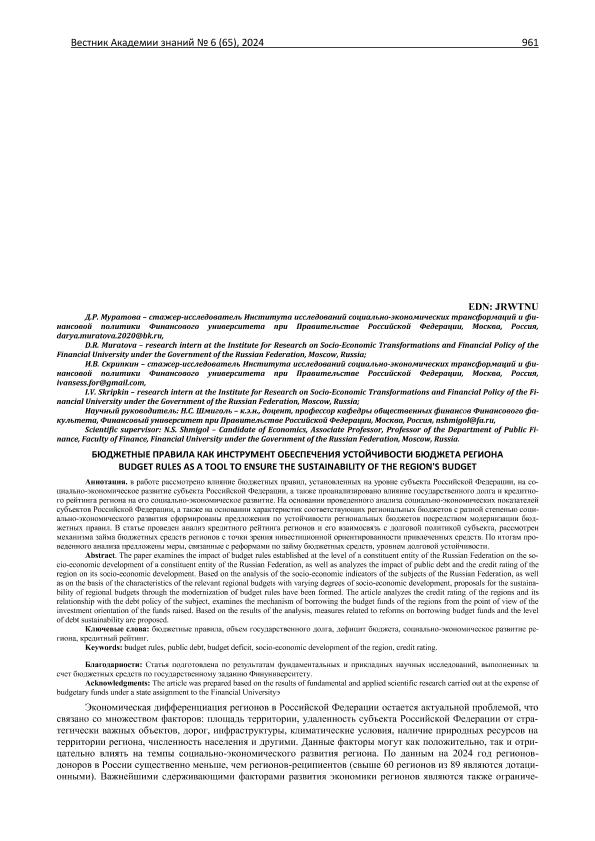 Муратова, Д.Р. Бюджетные правила как инструмент обеспечения устойчивости бюджета региона / Д.Р. Муратова, И.В. Скрипкин // Вестник Академии знаний. – 2024. – № 6. — С. 961-965. — Только в электронном виде. — <URL:http://elib.fa.ru/art2024/bv3497.pdf>.