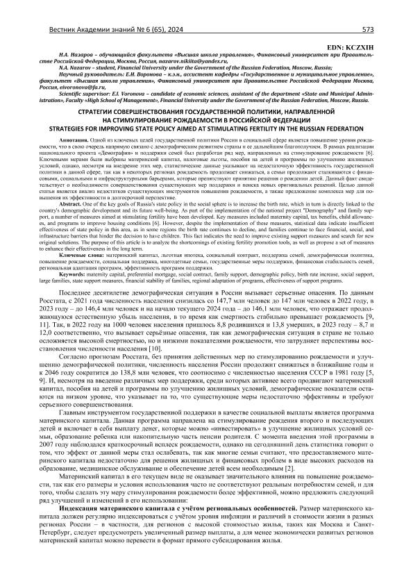 Назаров, Н.А. Стратегии совершенствования государственной политики, направленной на стимулирование рождаемости в Российской Федерации // Вестник Академии знаний. – 2024. – № 6. — С. 573-577. — Только в электронном виде. — <URL:http://elib.fa.ru/art2024/bv3498.pdf>.