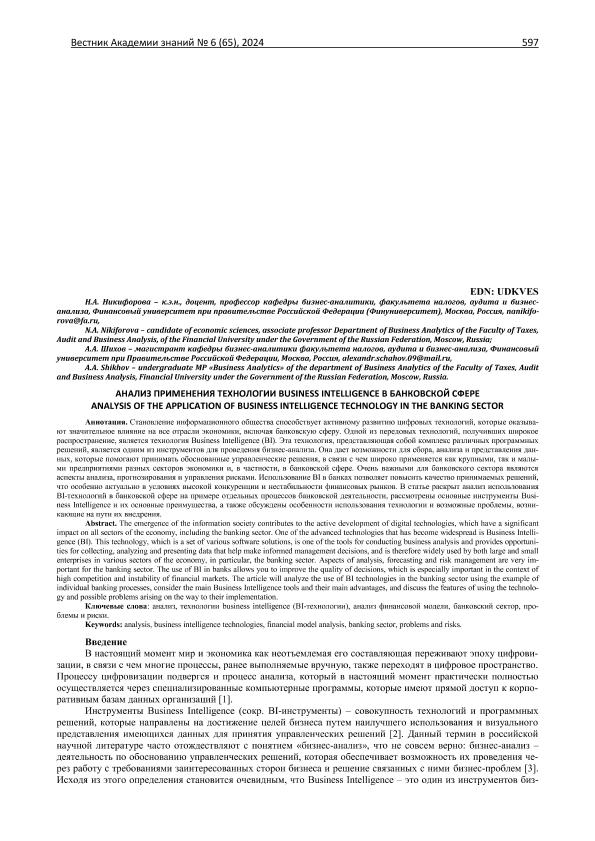 Никифорова, Н.А. Анализ применения технологии Business Intelligence в банковской сфере / Н.А. Никифорова, А.А. Шихов // Вестник Академии знаний. – 2024. – № 6. — С. 597-601. — Только в электронном виде. — <URL:http://elib.fa.ru/art2024/bv3500.pdf>.