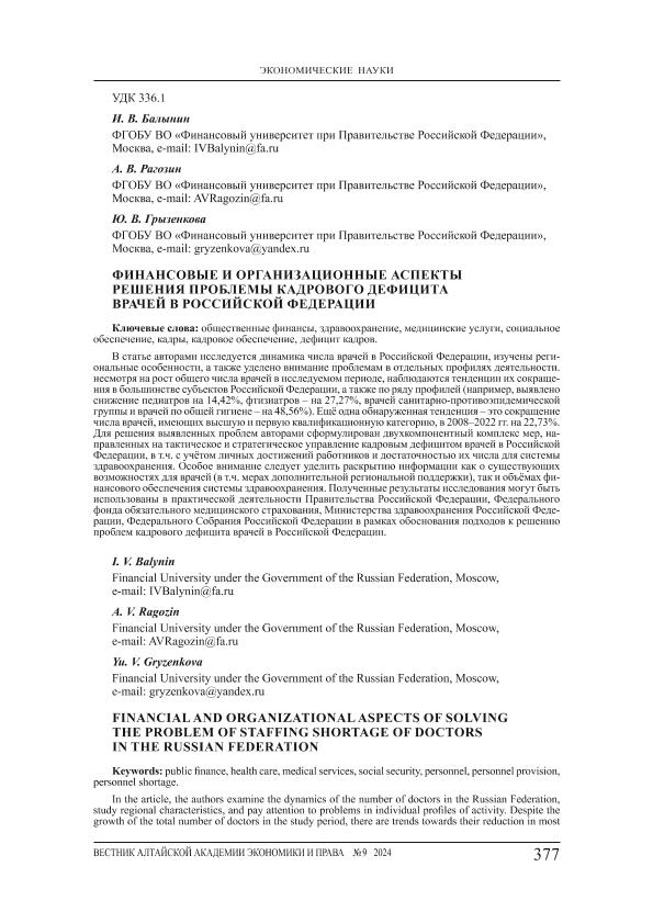 Балынин, И.В. Финансовые и организационные аспекты решения проблемы кадрового дефицита врачей в Российской Федерации / И.В. Балынин, А.В. Рагозин, Ю.В. Грызенкова // Вестник Алтайской академии экономики и права. – 2024. – № 9-3. — С. 377-382. — Только в электронном виде. — <URL:http://elib.fa.ru/art2024/bv3470.pdf>.