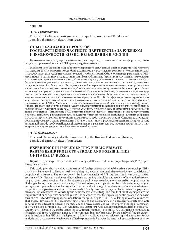 Губернаторов, А.М. Опыт реализации проектов государственно-частного партнерства за рубежом и возможности его использования в России // Вестник Алтайской академии экономики и права. – 2024. – № 9-2. — С. 183-188. — Только в электронном виде. — <URL:http://elib.fa.ru/art2024/bv3480.pdf>.