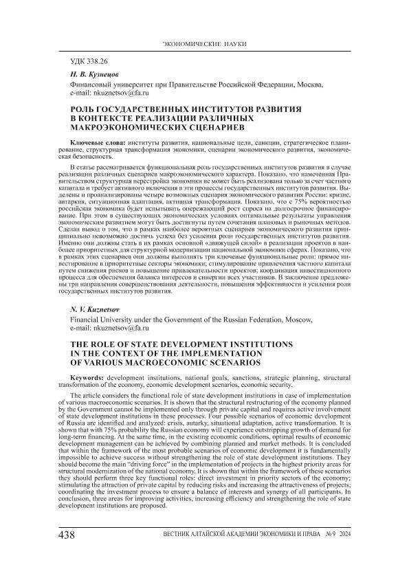 Кузнецов, Н.В. Роль государственных институтов развития в контексте реализации различных макроэкономических сценариев // Вестник Алтайской академии экономики и права. – 2024. – № 9-3. — С. 438-444. — Только в электронном виде. — <URL:http://elib.fa.ru/art2024/bv3489.pdf>.