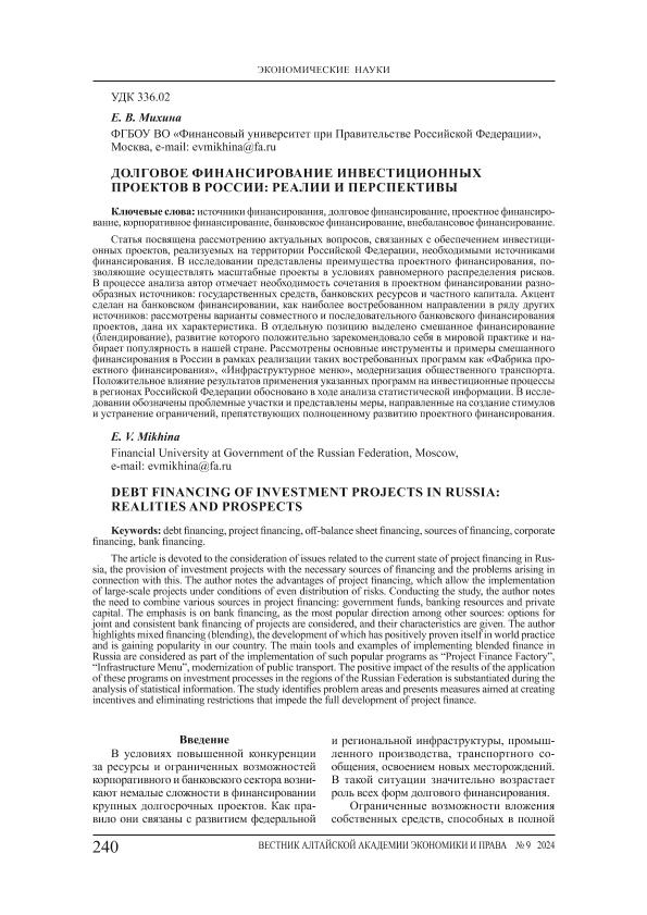 Михина, Е.В. Долговое финансирование инвестиционных проектов в России: реалии и перспективы // Вестник Алтайской академии экономики и права. – 2024. – № 9-2. — С. 240-246. — Только в электронном виде. — <URL:http://elib.fa.ru/art2024/bv3496.pdf>.