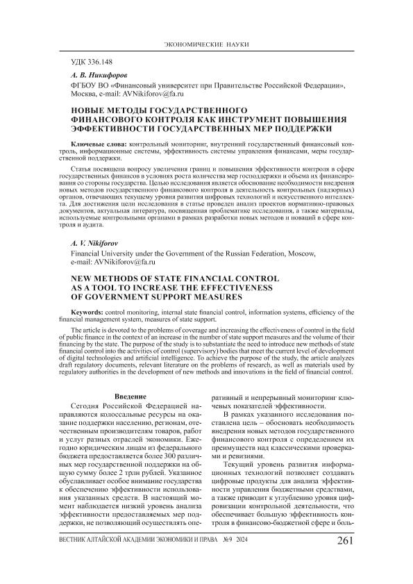 Никифоров, А.В. Новые методы государственного финансового контроля как инструмент повышения эффективности государственных мер поддержки // Вестник Алтайской академии экономики и права. – 2024. – № 9-2. — С. 261-265. — Только в электронном виде. — <URL:http://elib.fa.ru/art2024/bv3499.pdf>.