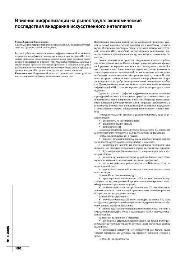 Савина, С.В. Влияние цифровизации на рынок труда: экономические последствия внедрения искусственного интеллекта // Экономика строительства. – 2025. – № 4. — С. 150-152. — Только в электронном виде. — <URL:http://elib.fa.ru/art2025/bv1557.pdf>.